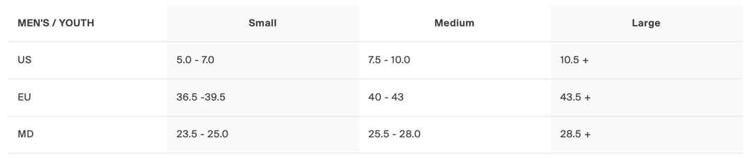 | US Men | * – 5.5 | 5.5 – 7.5 | 8 – 10 | 10.5 – 13 | 13 – 15 |
