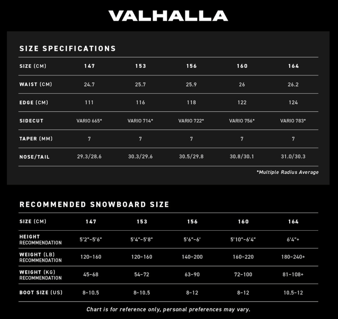 The 2026 Never Summer Valhalla is a powerful new freeride board, with a stiff flex and the a profile that will let you push your riding to the limits. The new Triple Camber Hybrid gives you all the pop and edge hold in even the iciest conditions, and the tip to tail Recluse Carbon Web gives the board a very responsive feel. The set back stance, with bat tail and 7mm of taper make light work of deep powder, so you can focus on what is coming up next instead of working to keep your board afloat.