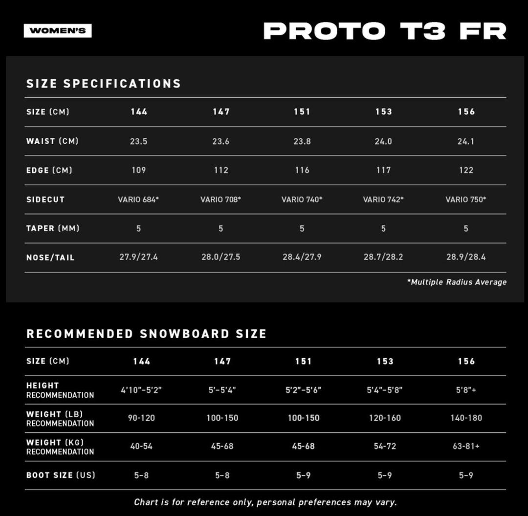 The 2026 Never Summer Women's Proto T3 FR seamless blends brand new Prototype 3 tech with the fan favourite Proto FR to create a hard charging board that loves to be ridden all over the mountain. This aggressive women's snowboard excels both on and off piste thanks to the tapered directional shape, stiffer flex pattern, and Triple Camber Hybrid profile, making it incredible responsive and able to handle whatever is in its way.