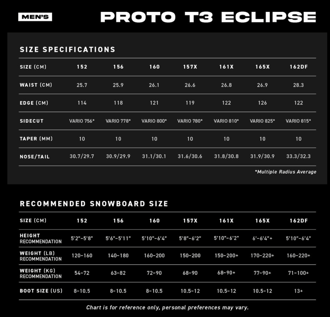 The 2026 Never Summer Men's Proto T3 Eclipse is packed with all the latest Never Summer technology and was built for both freeride and freestyle performance. Its Recurve Triple Camber Profile, combined with a 32mm setback and extended nose rocker, enhances Early-Rise and Float Mechanics for effortless control in all conditions. The Precision Stitched Carbon Matrix, showcased through the T3 Directional Carbon Mapping Embossment, maximises energy transfer and response and R.I.P. Edge-Hold Technology, 10mm of taper, and a carefully tuned flex pattern provide superior stability and lightning-fast edge-to-edge transitions.